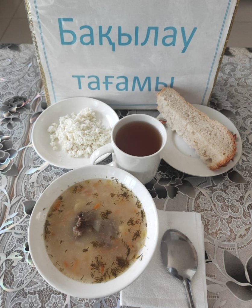 Күнделікті бақылау тағамдары шығарылады: вермишель сорпасы, қияр мен қызанақ салаты, алма сусыны, нан.