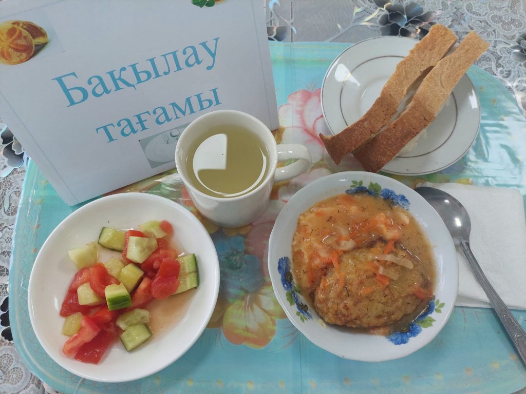 Күнделікті бақылау тағамдары шығарылады: гарнир: езілген картоп, тауық етінен жасалған котлет, шәй, нан.