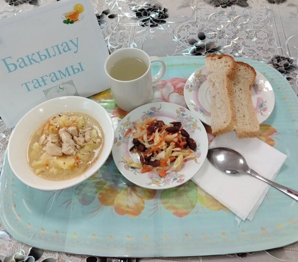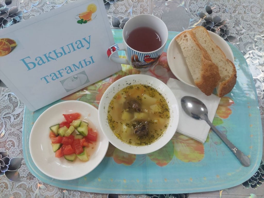 Күнделікті бақылау тағамдары шығарылады: вермишель сорпасы, қияр мен қызанақ салаты, алма сусыны, нан.