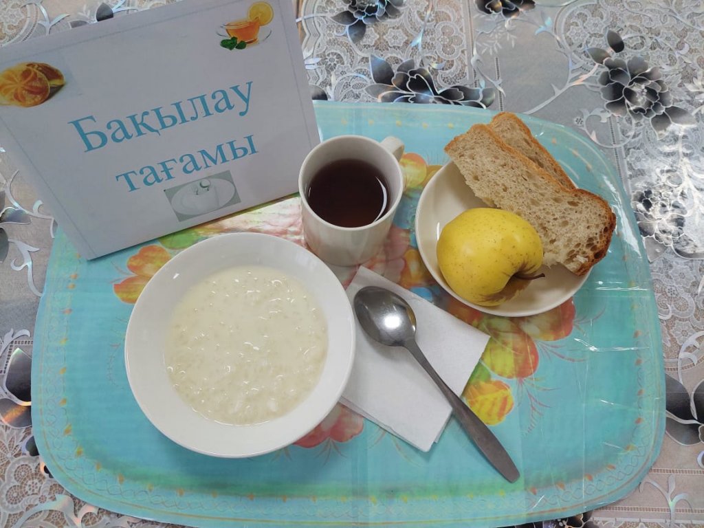 Күнделікті бақылау тағамдары шығарылады: сүтті күріш ботқасы, қара шәй, алма, нан.