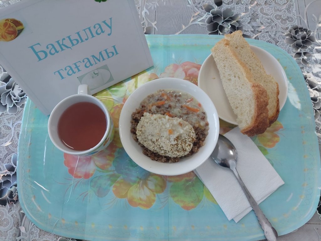Күнделікті бақылау тағамдары шығарылады: борщ, лимон сусыны, ірімшік, алма, нан.