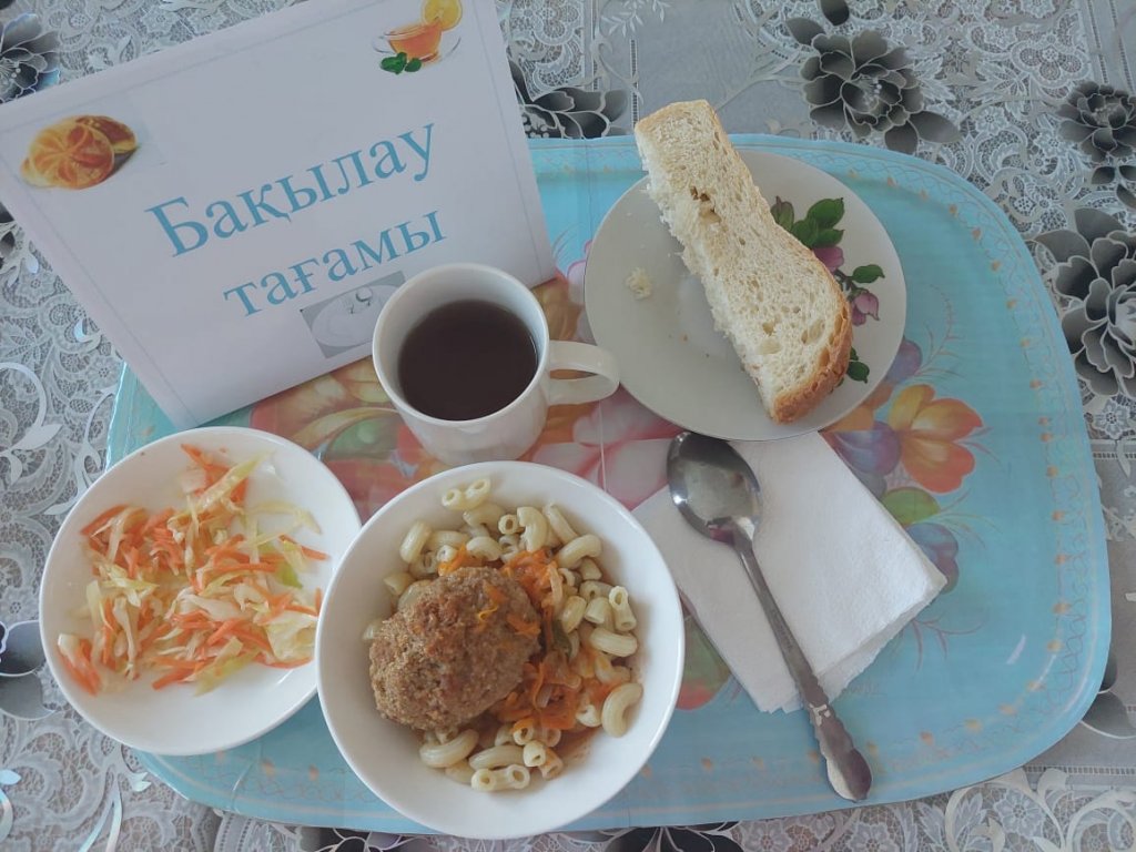 Күнделікті бақылау тағамдары шығарылады: макарондар, балық котлеттер, орамжапырақ салаты, шәй, нан.