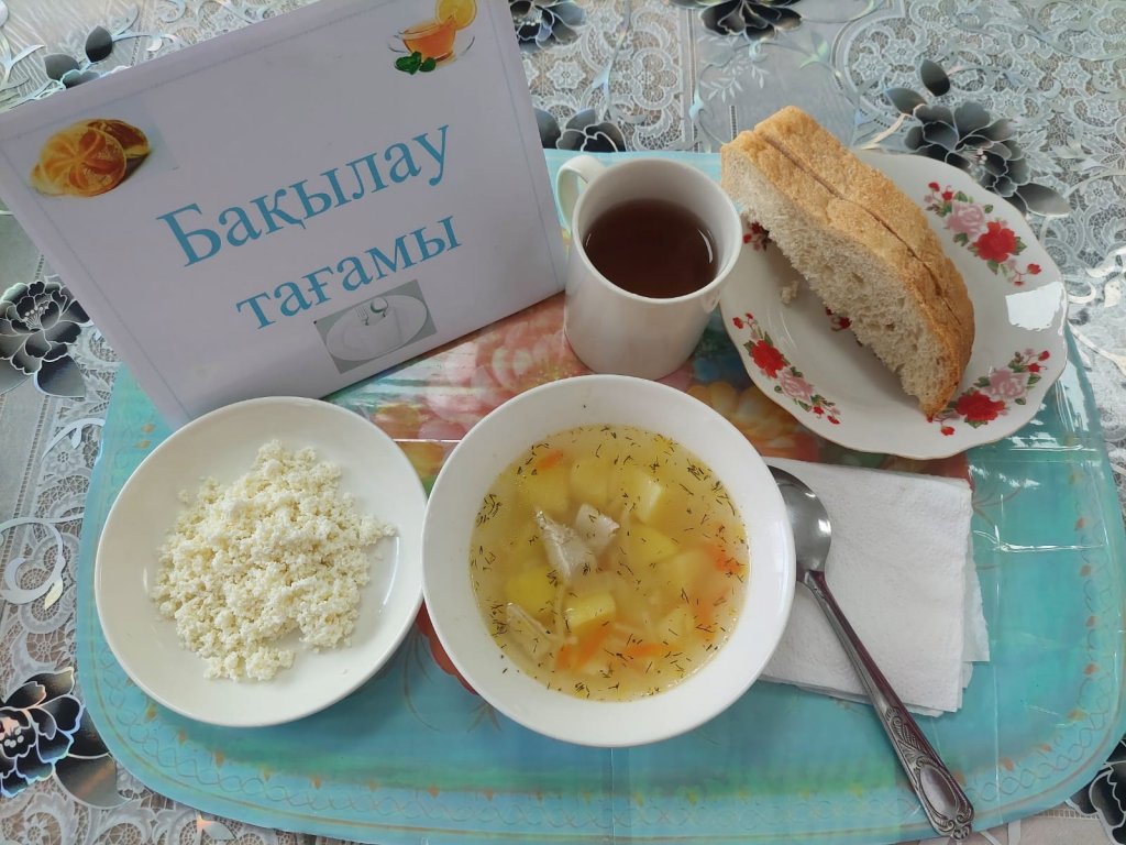 Күнделікті бақылау тағамдары шығарылады: вермишель сорпасы, шәй, сүзбе, нан.