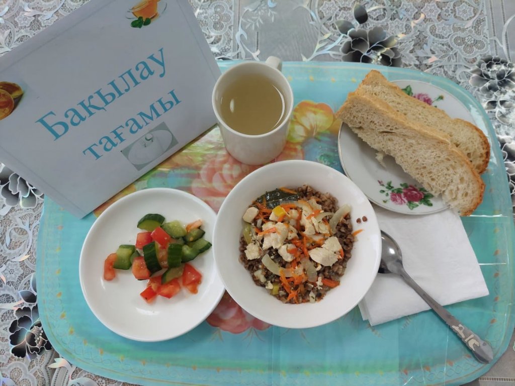 Күнделікті бақылау тағамдары шығарылады: гарнир: қарақұмық, тауық етімен қызыл тұздық, лимон сусыны,  қияр мен қызынақ  салаты, нан.