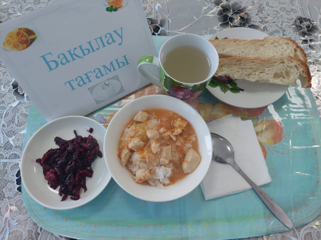 Күнделікті бақылау тағамдары шығарылады: гарнир: күріш, тауық етінен жасалған қызыл тұздық, алма лимон компоты, нан, ірімшік қосылған қызылша салаты.