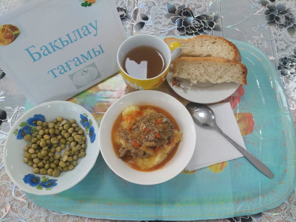 Күнделікті бақылау тағамдары шығарылады: езілген картоп, ақ тұздық, жалқау қырыққабат орамдары, мейіз қосылған алма компоты, жасыл бұршақ, нан.