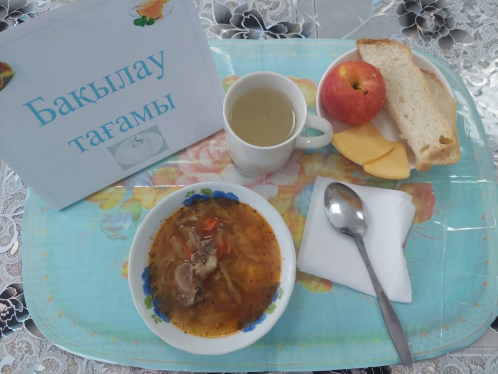 Күнделікті бақылау тағамдары шығарылады: борщ, лимон сусыны, ірімшік, алма, нан.