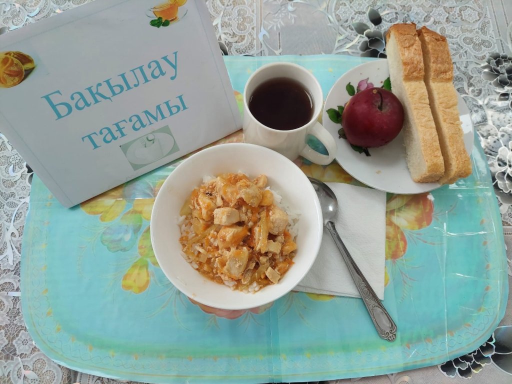 Күнделікті бақылау тағамдары шығарылады: гарнир: күріш, тауық етен жасалған қызыл тұздық, алма, нан, қара шәй.