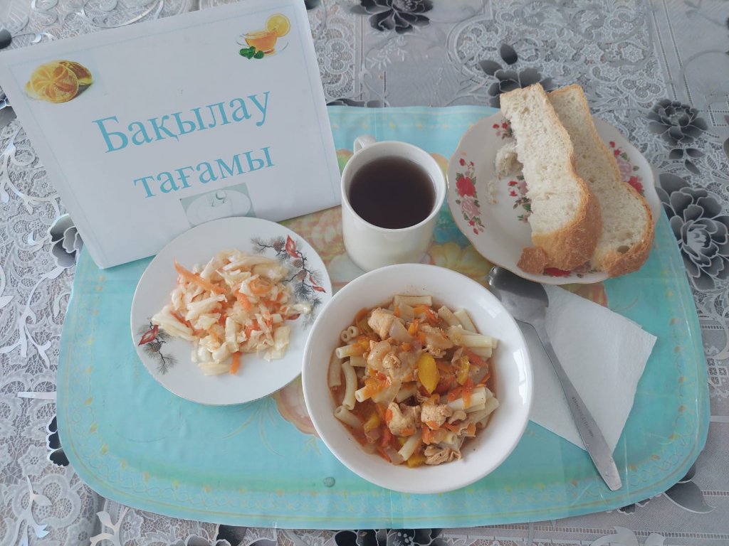 Күнделікті бақылау тағамдары шығарылады: макарондар, тауық етімен тұздық, сәбіз қосылған орамжапырақ салаты, шәй, нан.