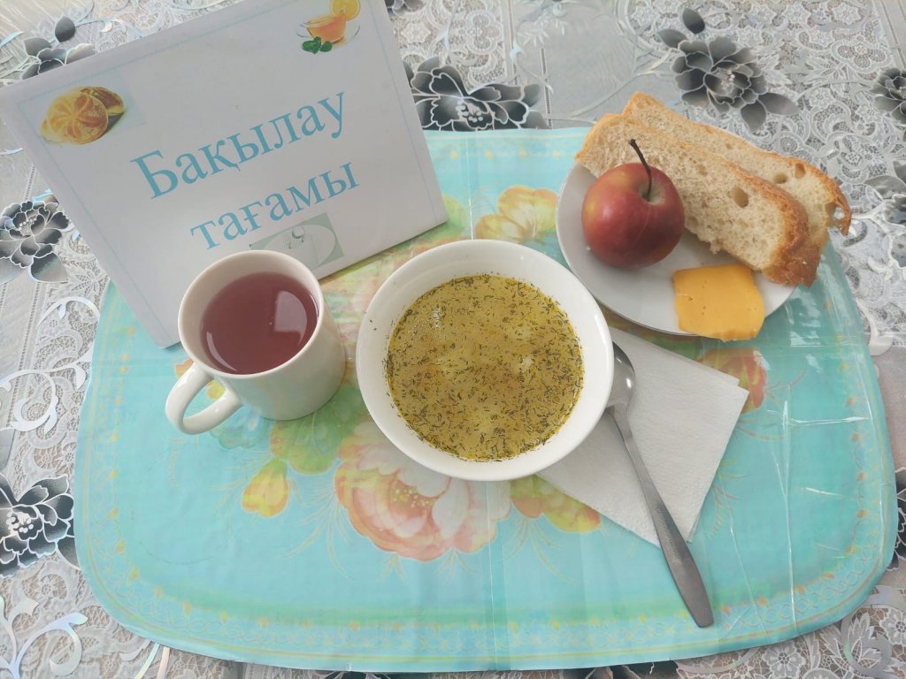 Күнделікті бақылау тағамдары шығарылады: балық сорпасы, алма, ірімшік, алмадан жасалған компот, нан.